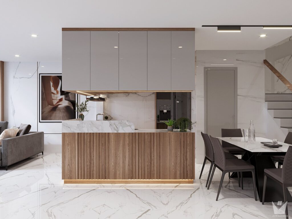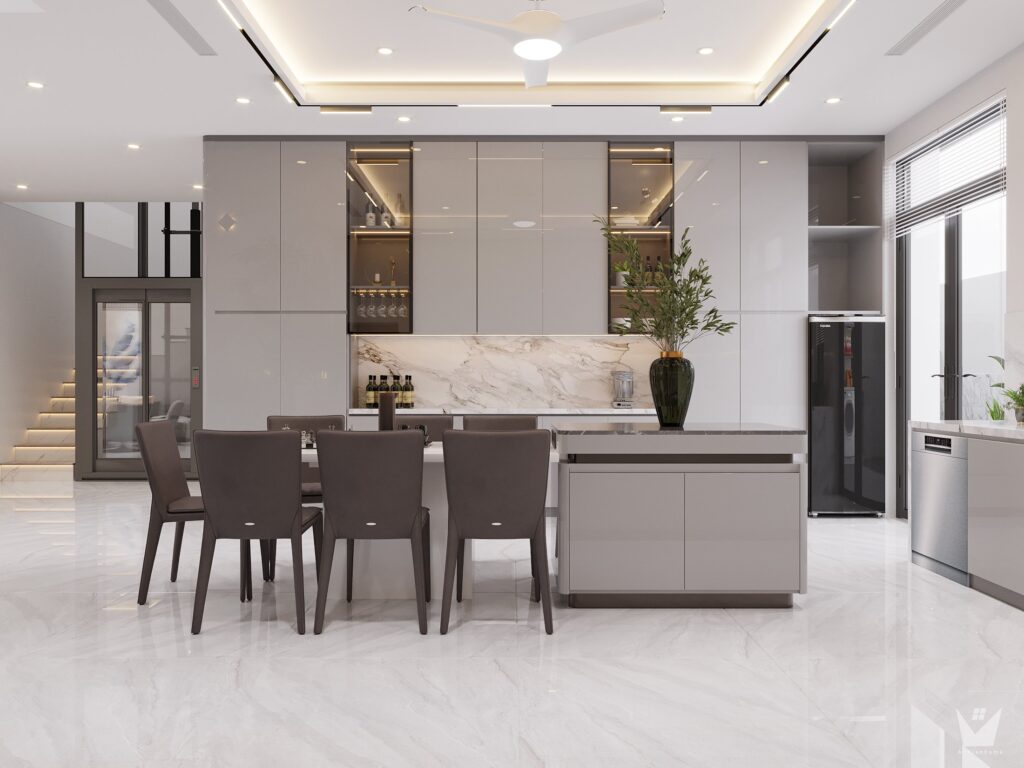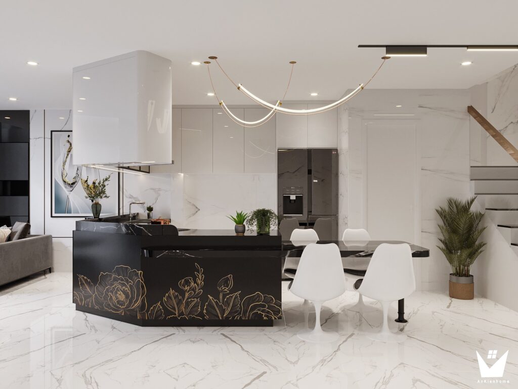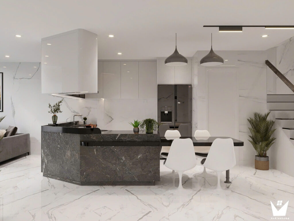 Nhà bếp nên được thiết kế theo không gian mở, liên thông với phòng khách – xu hướng hiện đại được nhiều gia đình ưa chuộng. Thiết kế này không chỉ giúp không gian trở nên thông thoáng, rộng rãi mà còn tiết kiệm chi phí xây dựng. Bên cạnh đó, không gian mở giúp các thành viên trong gia đình dễ dàng tương tác, tạo cảm giác gắn kết, và người nấu ăn có thể vừa nấu nướng vừa trò chuyện với người thân yêu.