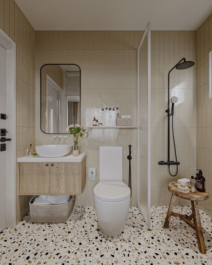 - Đồng nhất trong chất liệu nội thất phòng tắm cũng là một yếu tố cần lưu ý. Đồ nội thất nên được kết hợp với nhau theo một tông màu thống nhất, chất liệu hiện đại, sang trọng, đơn giản.